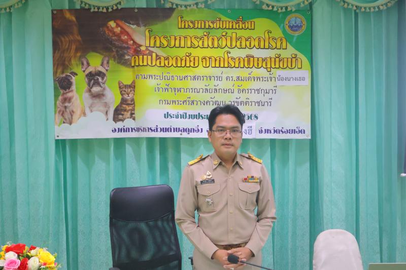 นายอนันตสิทธิ์ ปีขาน นายก องค์การบริหารส่วนตำบลดูกอึ่ง มอบหมาย นายพจวรุณ นาสุรินทร์ รองนายกฯ เป็นประธาน โครงการขับเคลื่อน โครงการสัตว์ปลอดโรค คนปลอดภัย จากโรคพิษสุขนัขบ้า ตามพระปณิธานศาตราจารย์ ดร.สมเด็จพระเจ้าน้องนางเธอเจ้าฟ้าจุฬาภรณวลัยลักษณ์ อัคราชกุมารี กรมพระศรีสวางควัฒน วรขัตราชกุมารี ประจำปีงบประมาณ 2568 ณ ห้องประชุม อบต.ดูกอึ่ง